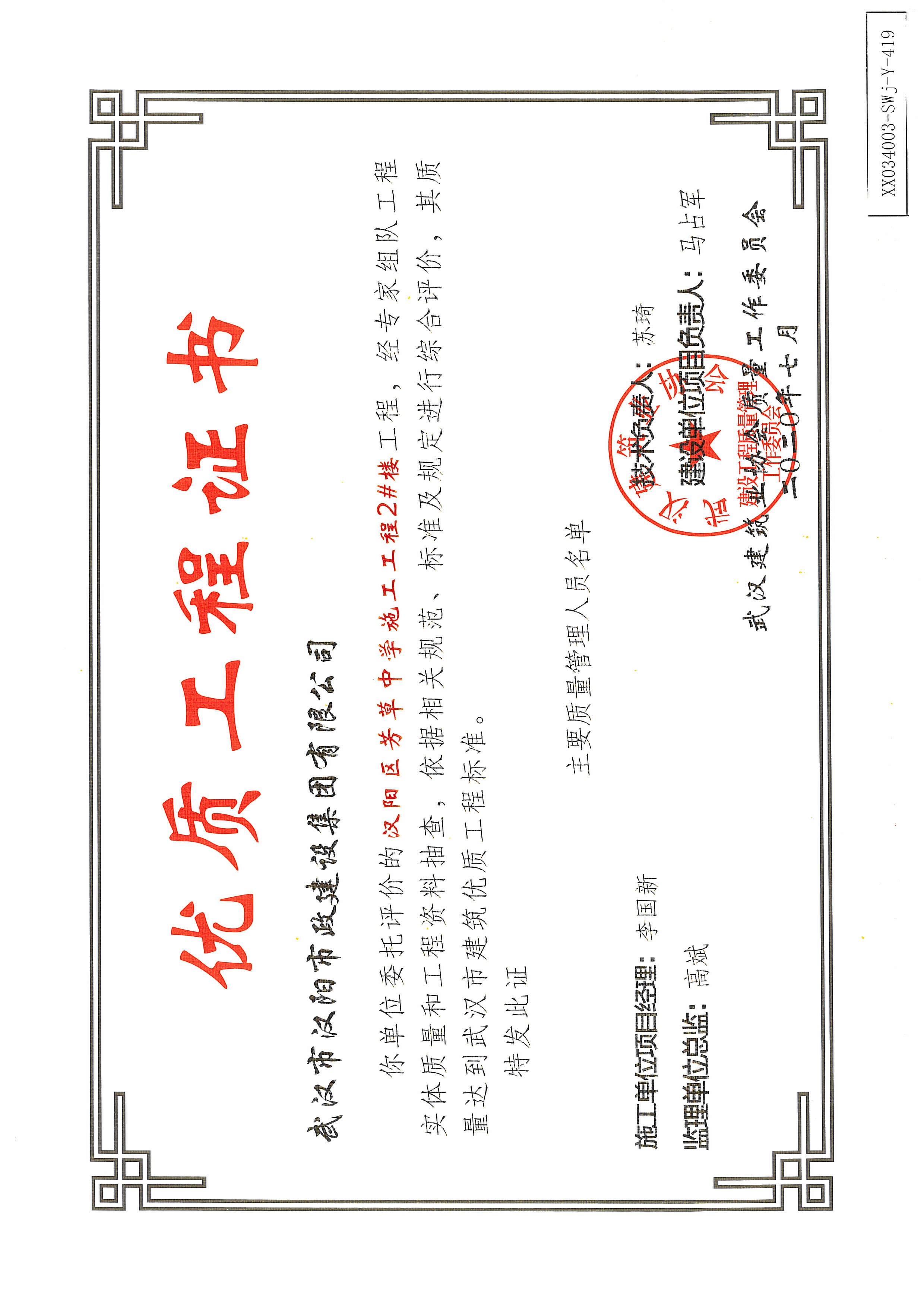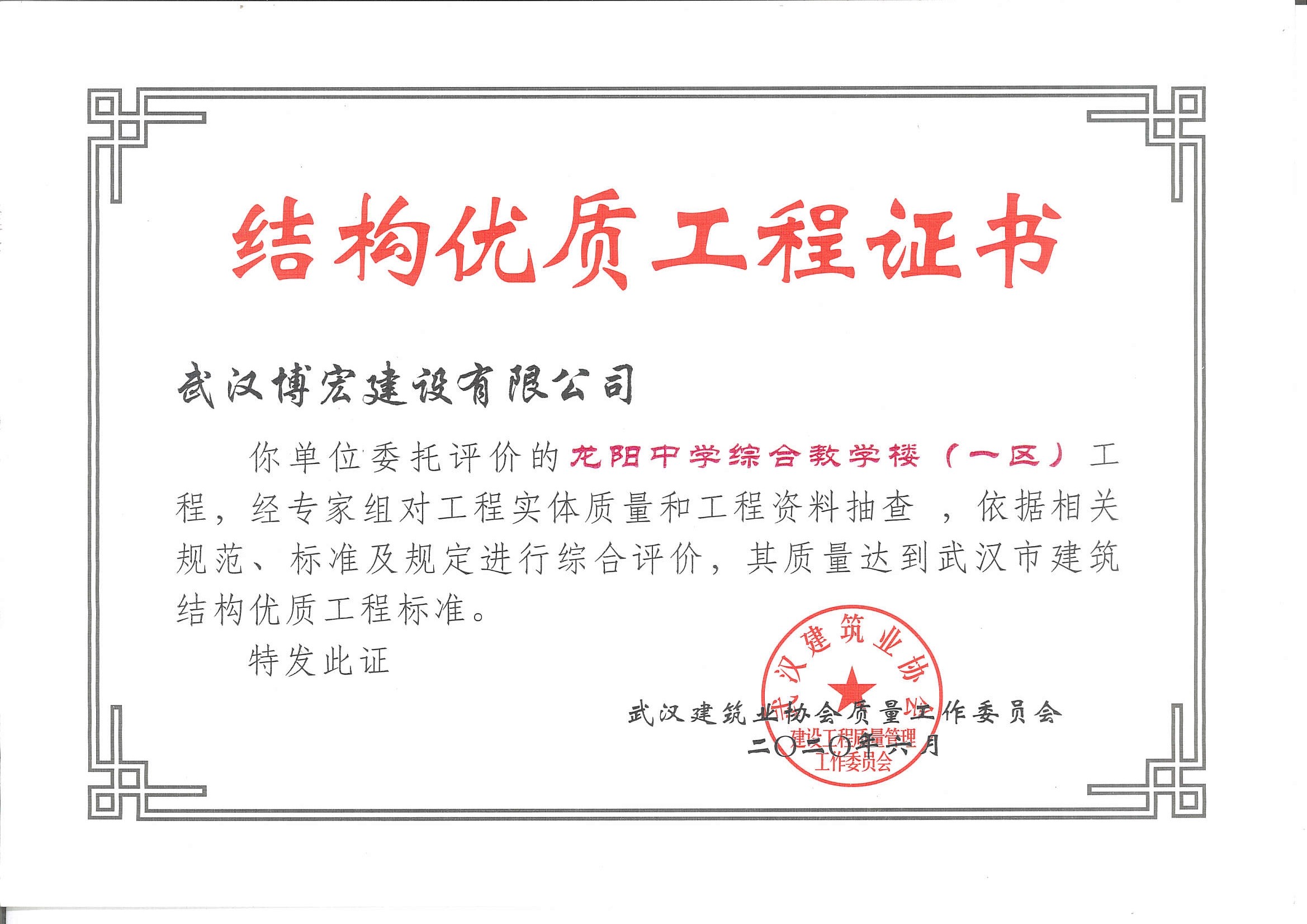 優(yōu)質工程證書(武漢四新中學建設項目工程(綜合教學1--4號樓)