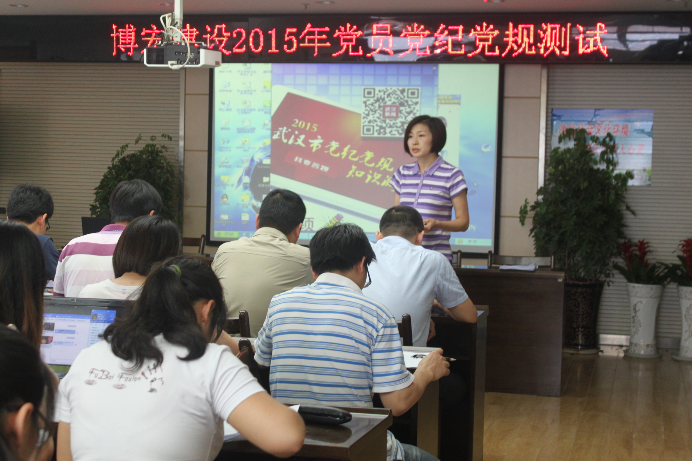 根據(jù)武漢市、漢陽區(qū)紀委統(tǒng)一要求,2015年5月29日下午,我公司黨支部組織全體黨員參加了2015年黨紀黨規(guī)測試。公司39名黨員同志通過集中考試,學習了廉政建設(shè)、黨紀黨規(guī)、政治常識等方面的內(nèi)容,全體黨員在黨紀黨規(guī)認識上有了新提高,紛紛表示要進一步加強學習,積極發(fā)揮先鋒模范作用。