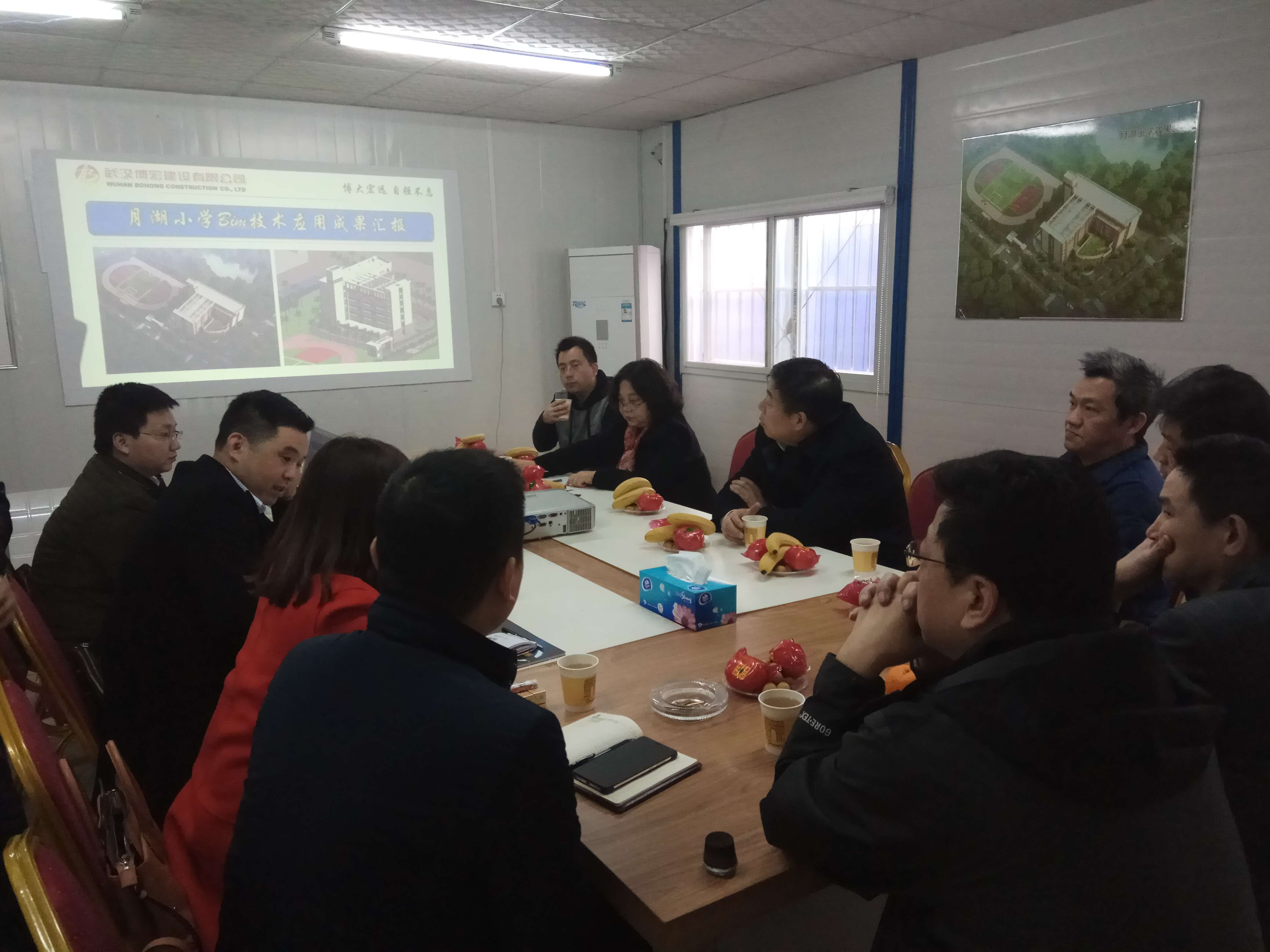 考察交流會議上為加強(qiáng)雙方了解,公司經(jīng)營副總蘇琦首先就公司近年來發(fā)展及資質(zhì)情況進(jìn)行了簡單介紹。接下來公司副總工程師梅浩對BIM技術(shù)在月湖小學(xué)施工建設(shè)中取得的效果進(jìn)行了概述??偣まk文志勇從圖紙審查、碰撞檢查、可視化交底、砌體排磚、進(jìn)度質(zhì)量安全管理、施工模擬等多個(gè)方面一一介紹BIM技術(shù)為月湖小學(xué)工程建設(shè)帶來的成果及效益,總結(jié)了BIM技術(shù)應(yīng)用經(jīng)驗(yàn),并簡單介紹了下一步BIM應(yīng)用計(jì)劃安排。