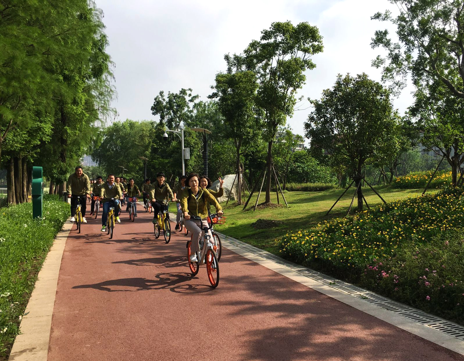 五月的清晨涼風(fēng)習(xí)習(xí),天氣爽朗。上午八點(diǎn)半,大家統(tǒng)一著裝,齊聚墨水湖公園,黨支部書記周紅一番激情飛揚(yáng)的致辭迎來(lái)了本次活動(dòng)的重點(diǎn)——騎行參觀我公司承建的墨水湖公園項(xiàng)目。