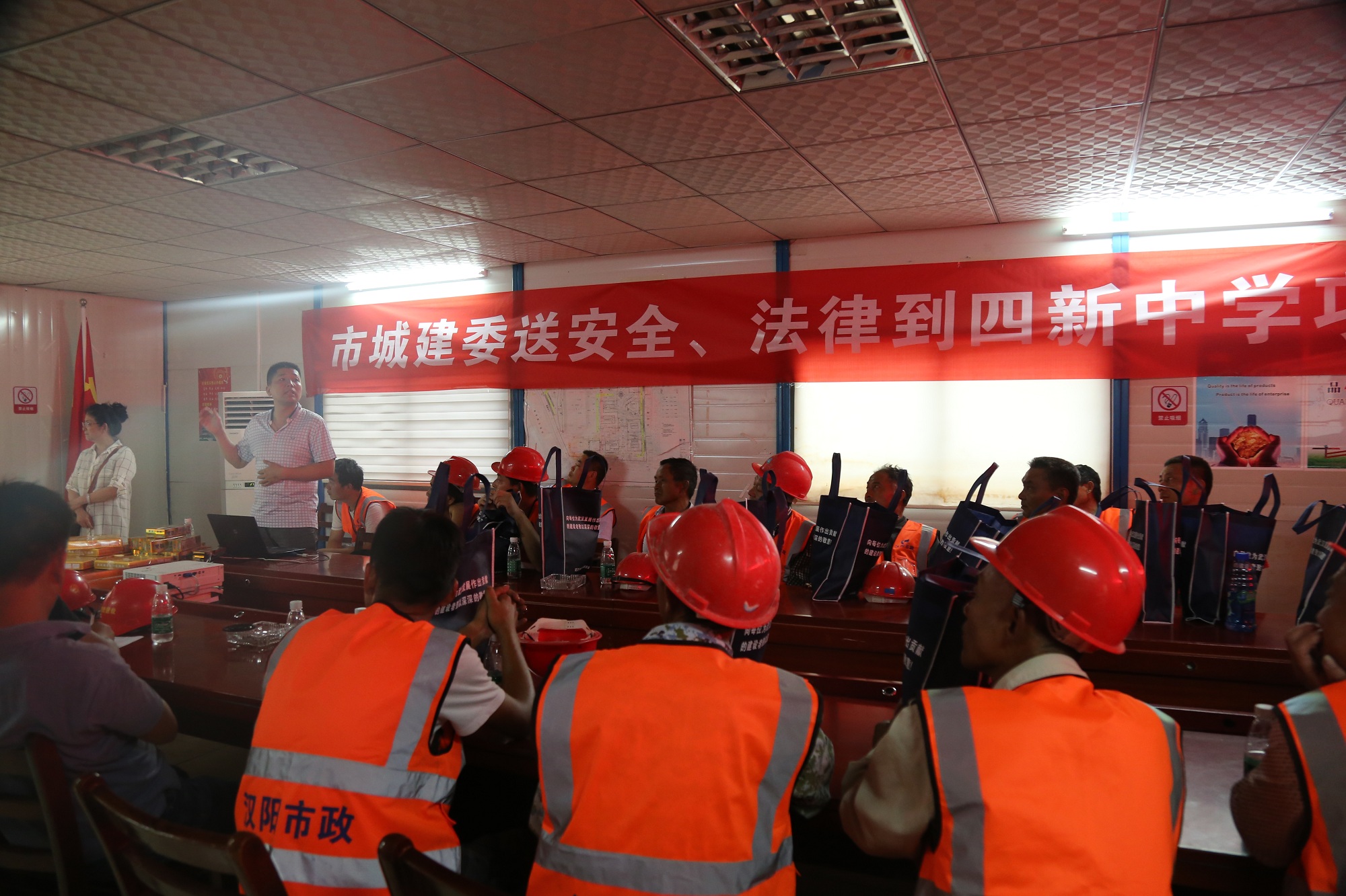 當天下午,武漢四新中學建設項目再次迎來一批客人,武漢市城建委邀請建筑安全、法律專業(yè)講師來到項目農民工業(yè)余學校,集中對40余名工友進行了安全及法律培訓,并為辛苦一天的工友送上慰問品一份。培訓中采取“講述+互動”的形式,廣大工友爭相回答培訓中提出的相關問題,現(xiàn)場掌聲不斷,氣氛活躍,民工參與度極高,整場培訓充分展現(xiàn)了公司對農民工教育的優(yōu)異成果,也進一步提升了廣大工友的安全法律意識。