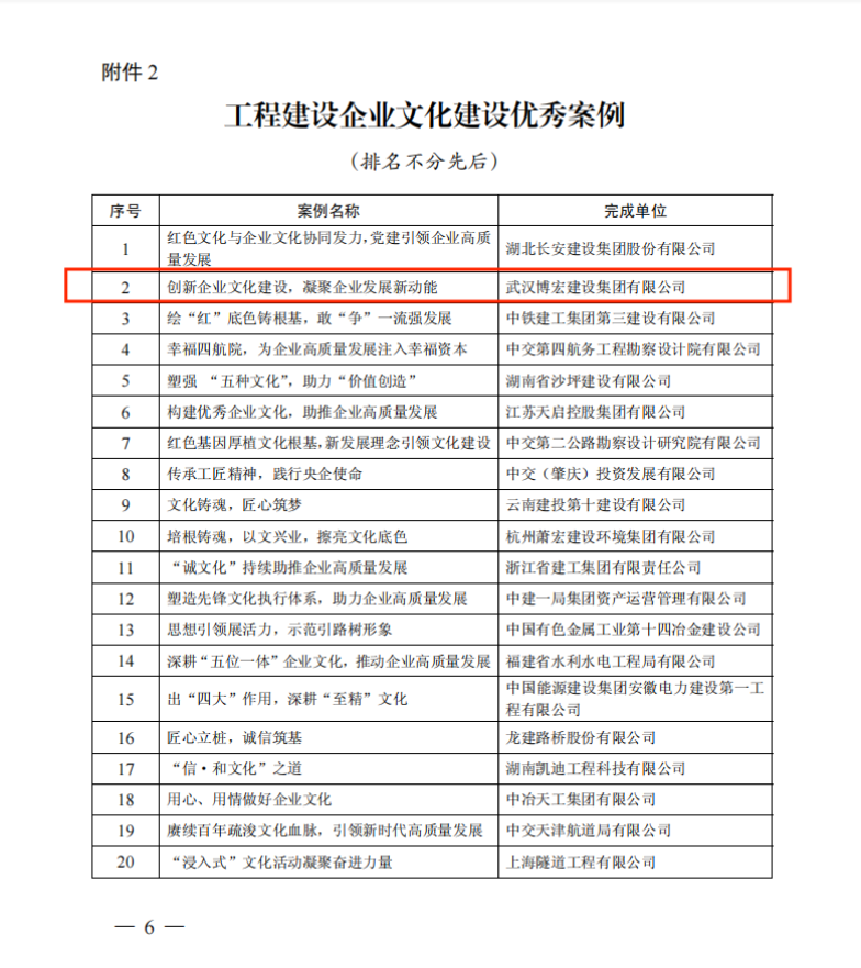 本次榮譽(yù)的獲得是對公司積極推進(jìn)企業(yè)文化建設(shè)工作成果的肯定,未來博宏建設(shè)集團(tuán)將繼續(xù)全面做好企業(yè)文化建設(shè)各項工作,凝聚全體員工的干事熱情,努力打造競爭型、管理型、質(zhì)量型的一流房建企業(yè)。