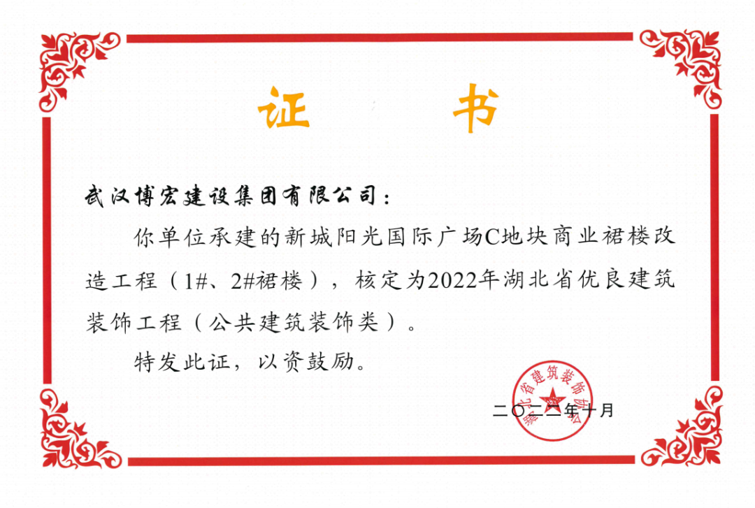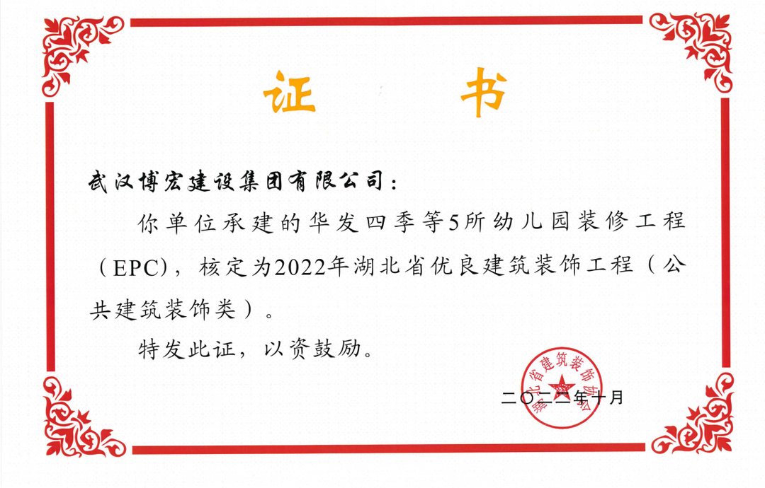 近日,湖北省建筑裝飾協(xié)會發(fā)布了《關于開展2022年湖北省建筑裝飾工程質量目標考核工作的通知》,由博宏建設集團承建的華發(fā)四季等5所幼兒園裝修工程(EPC)、新城陽光國際廣場C地塊商業(yè)裙樓改造工程(1#、2#裙樓)、新城陽光國際廣場D地塊商業(yè)裙樓改造工程(D座裙樓)、武漢市漢陽區(qū)八所中小學新建PPP項目-永安堂小學被核定為“2022年湖北省優(yōu)良建筑裝飾工程(公共建筑裝飾類)”。