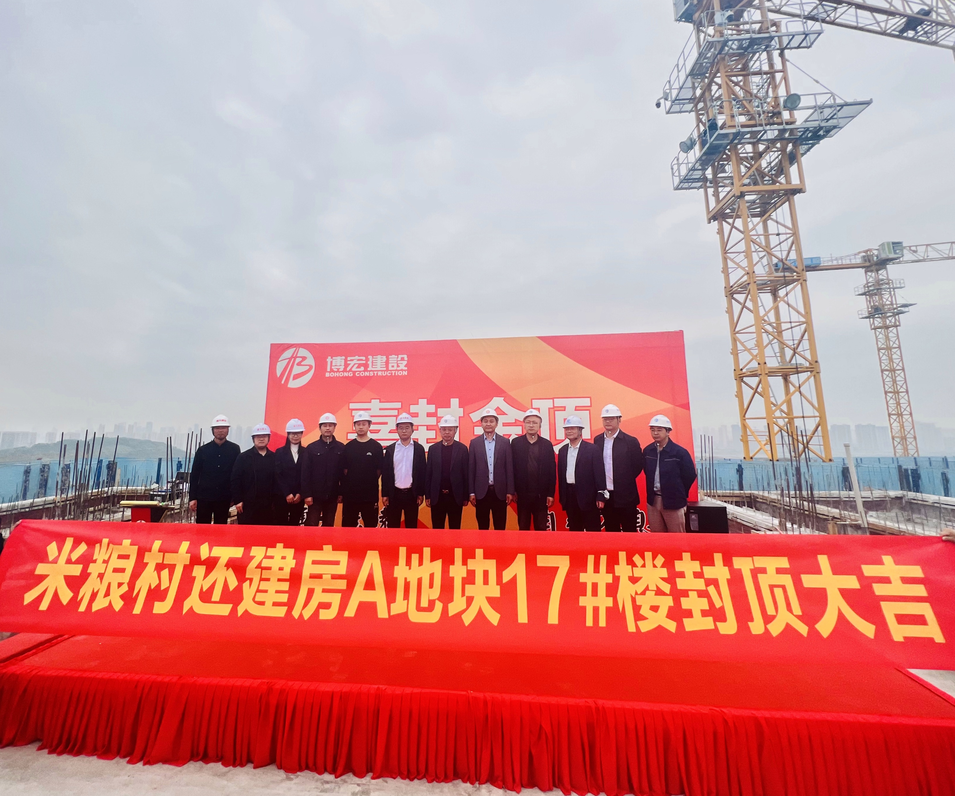 4月28日上午10時,伴隨著最后一方混凝土澆筑到位,米糧村還建房A地塊17#樓主體結(jié)構(gòu)順利封頂,提前15天完成該工期目標(biāo)。博宏建設(shè)集團常務(wù)副總經(jīng)理奚雷及各參建單位代表出席此次封頂儀式共同見證這一重要時刻。