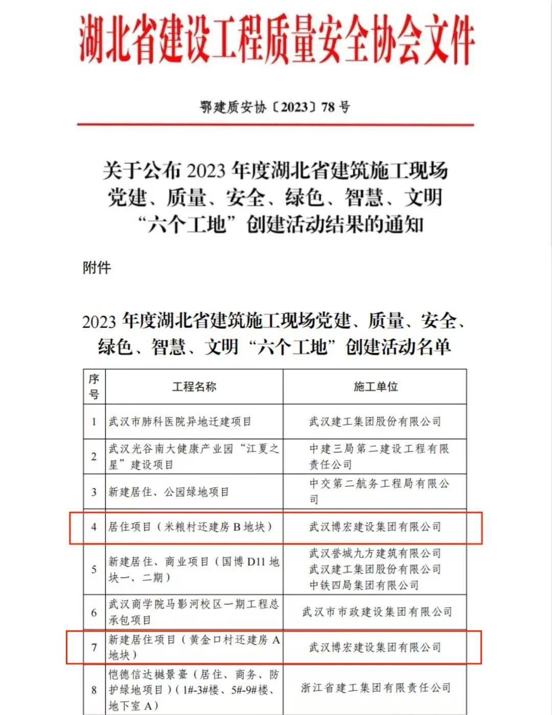 近日,湖北省建設(shè)工程質(zhì)量安全協(xié)會公布了2023年度湖北省建筑施工現(xiàn)場黨建、質(zhì)量、安全、綠色、智慧、文明“六個(gè)工地”評比結(jié)果名單,由博宏建設(shè)集團(tuán)承建的居住項(xiàng)目(米糧村還建房B地塊)、新建居住項(xiàng)目(黃金口村還建房A地塊)喜獲殊榮。